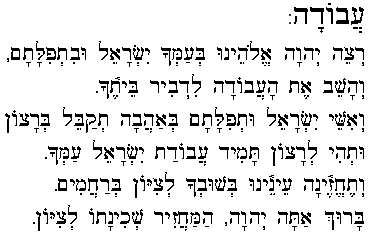 Translation: Accept Your people, O Lord our God, and receive their prayer. Restore the most holy service of Your house and accept in love the offerings and prayers of Israel. May it please You always to want to accept the service of Your people Israel. May our eyes see You return to Zion in mercy. Blessed are You, O Lord, Who restores His Presence to Zion.