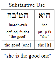Since there are two possible genders and two possible numbers, there are four forms for every adjective, to agree with the four possible forms of nouns (adjectives do not have a "dual" form as some nouns but use the plural form). Happily, the endings for adjectives parallel the endings you have already learned for nouns, so learning the inflections for adjectives is relatively easy. On the other hand, since Hebrew adjectives share the same endings as nouns, they can be difficult to recognize at times. Moreover adjectives can function substantively, that is, as "adjectival nouns."